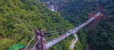 古龍峽觀瀑玻璃橋,位于景區(qū)萬丈崖瀑布群核心景點內,全長339.2米,平均寬度3.8米,最大寬度6.8米,創(chuàng)CWRA“世界上最寬的觀瀑玻璃吊橋”世界紀錄。